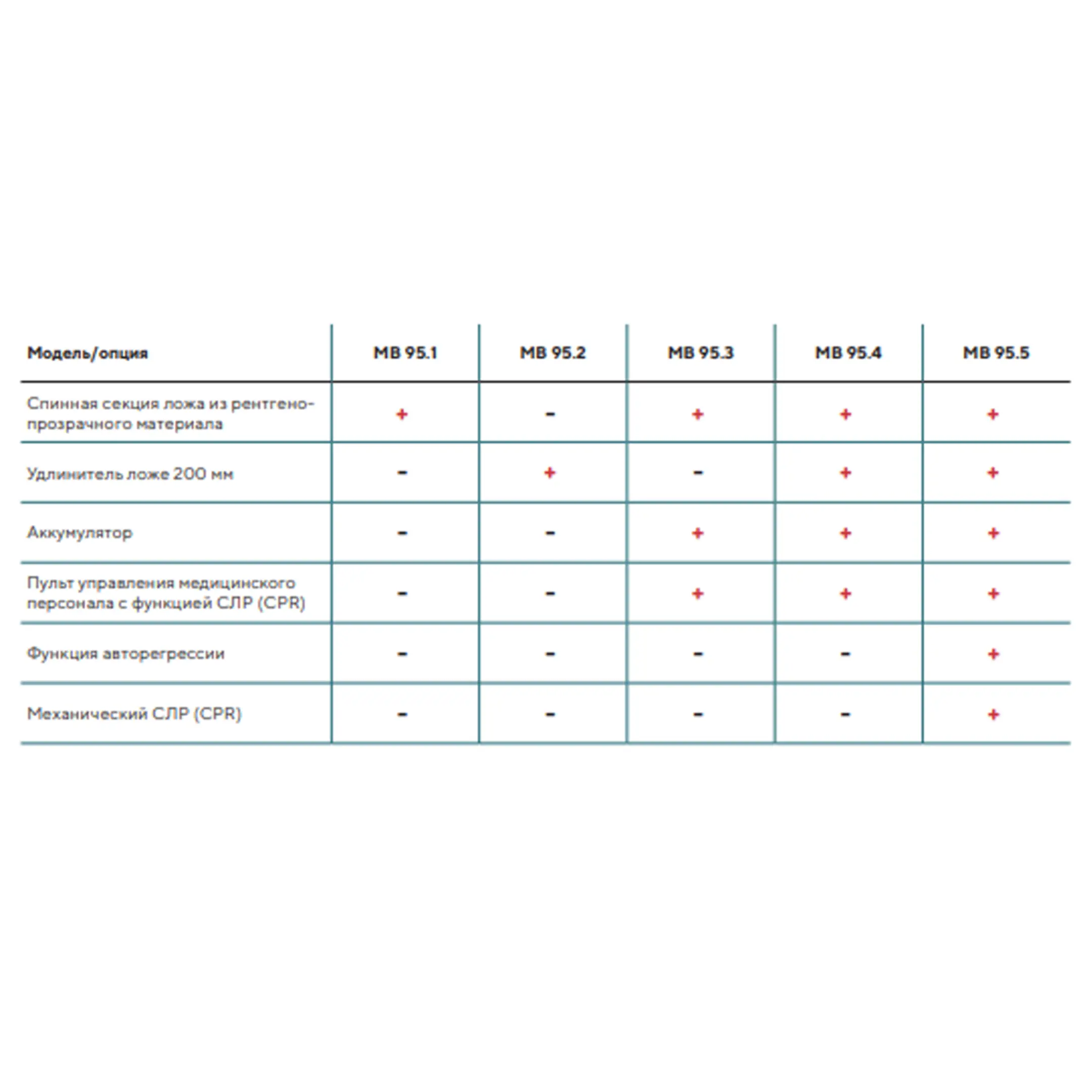 В отличие от кровати MB-95, модель MB-95.1 включает в себя:спинная секция, выполненная из рентгено-прозрачного материала.
