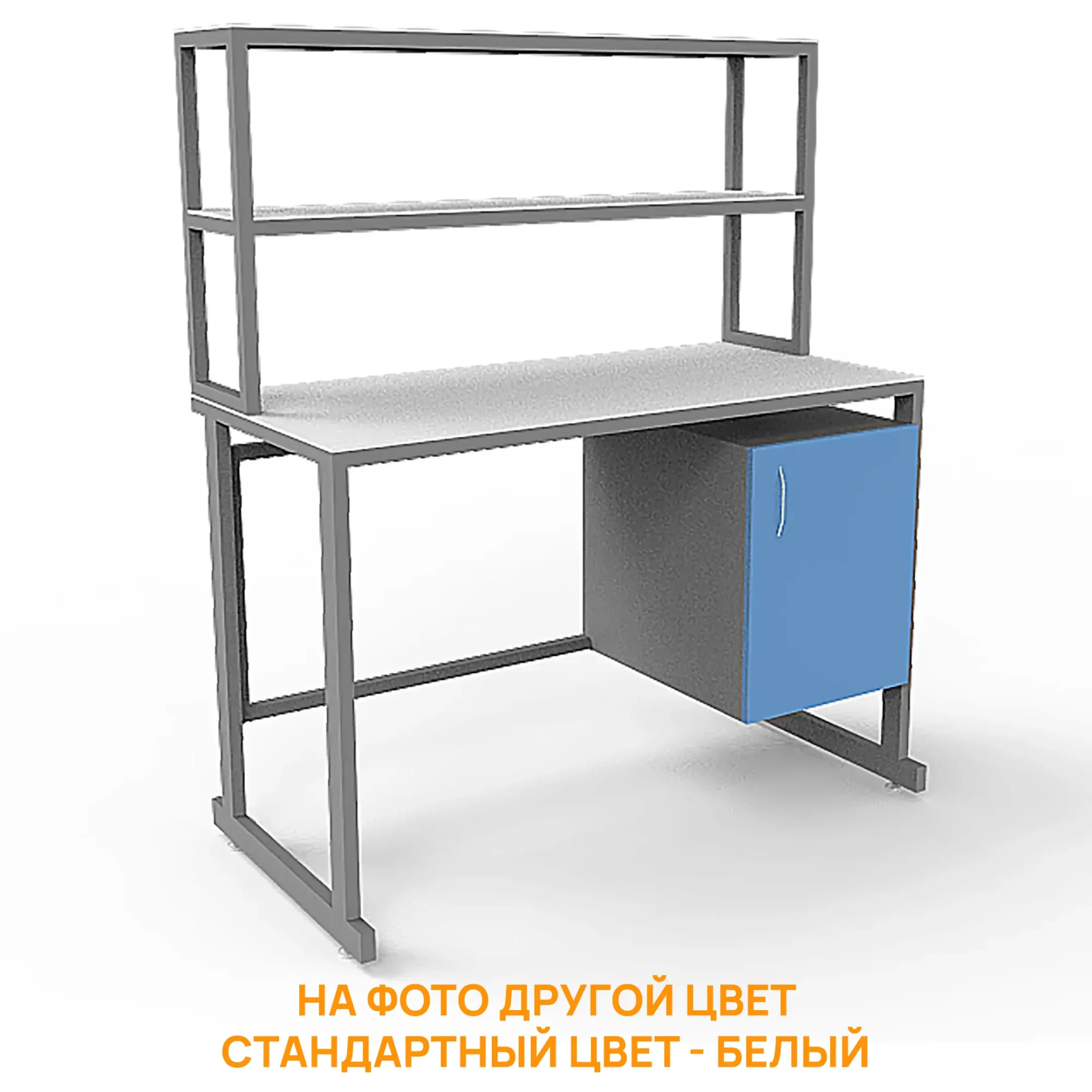 - Удобная система хранения — тумба под столешницей с распашной дверцей и надстройка с двумя полками для хранения материалов и оборудования.