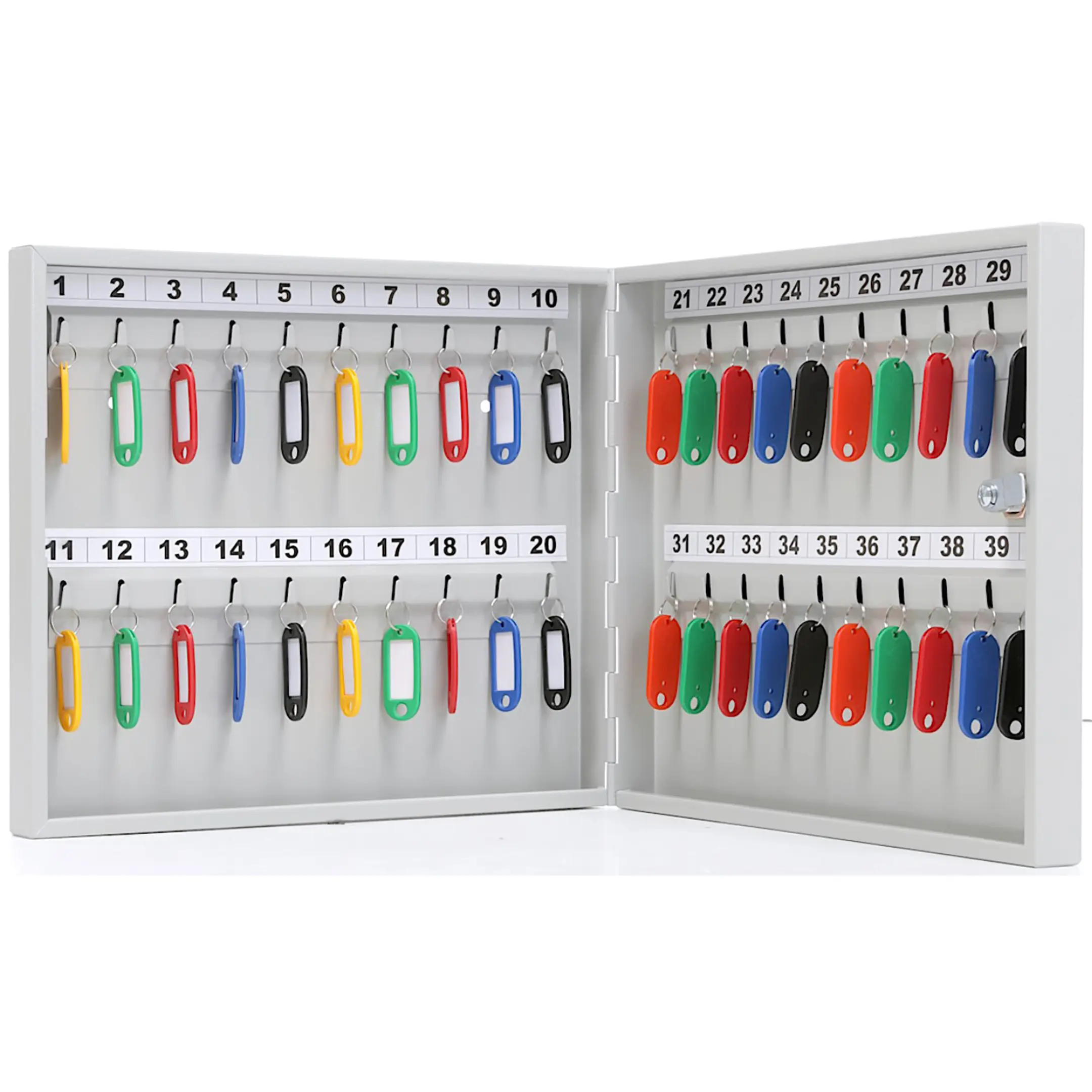 - Базовая организация для ограниченного набора ключей — сорок пронумерованных ячеек и комплект брелков создают простую и наглядную систему. Это позволяет мгновенно находить нужный ключ, избегая путаницы, и вести элементарный учет их выдачи, что экономит время и поддерживает порядок.