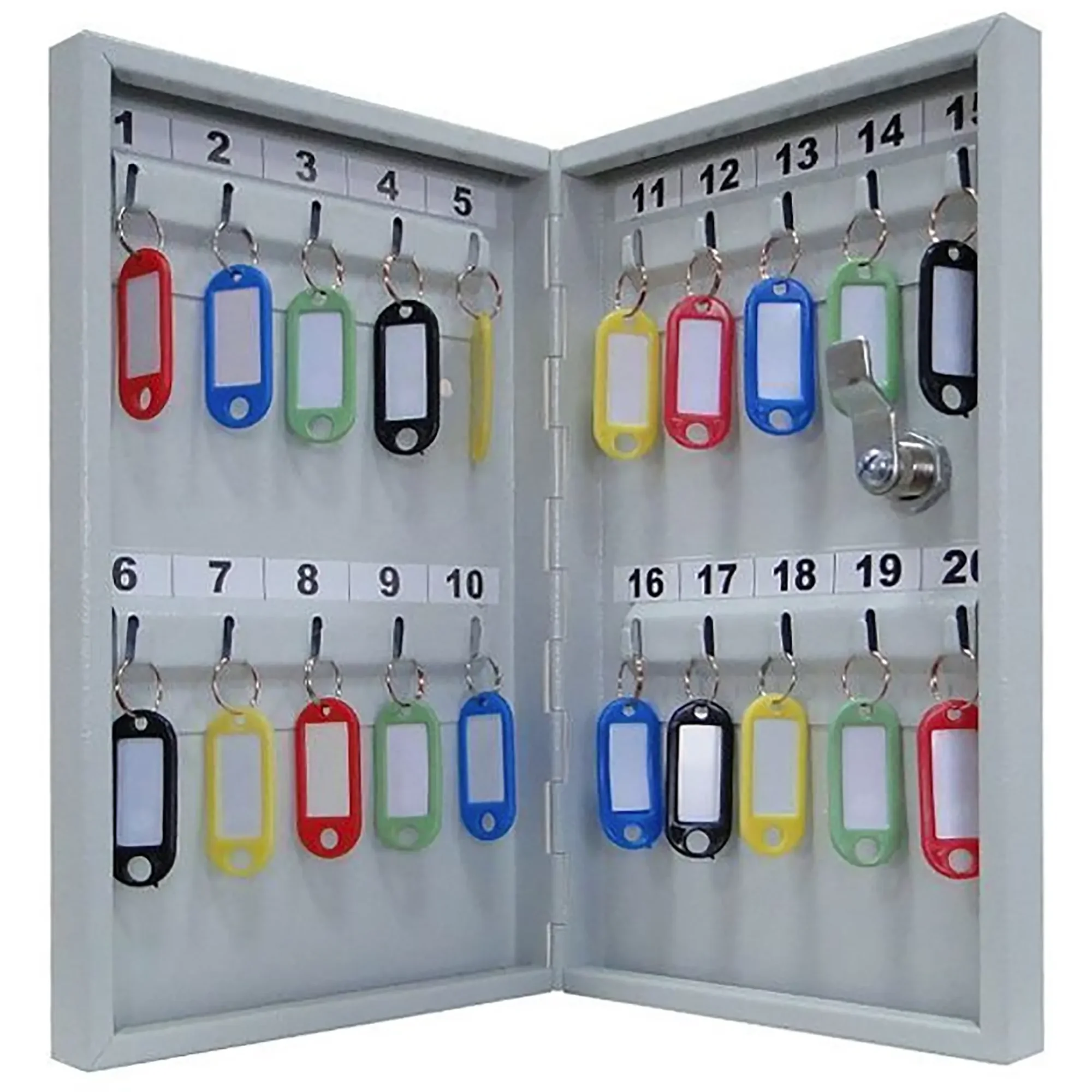 - Базовая, но эффективная система организации — двадцать пронумерованных ячеек и комплект брелков создают простую и наглядную систему. Это позволяет мгновенно находить нужный ключ, избегая путаницы в связках, и вести элементарный учет их выдачи, если это необходимо.