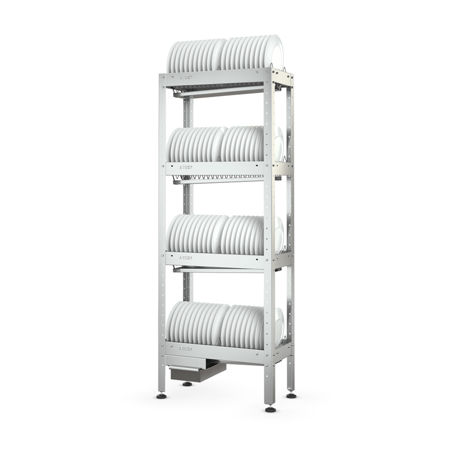 Открытый стеллаж-сушилка ATESY СКТ-1/600 предназначен для оснащения моечных отделений предприятий общепита и торговли. Сушильный стеллаж комплектуется четырьмя полками с кассетами. Тарелки плотно фиксируются в ячейках, высыхают благодаря естественной циркуляции воздуха, а остатки воды с мокрой посуды свободно стекают в поддон.