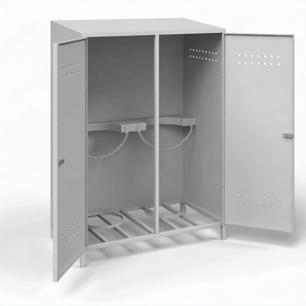 - Гарантированное обеспечение пожарной безопасности — шкаф служит надежным барьером, изолирующим два пропановых баллона от источников открытого огня, искр и теплового излучения. Обязательная система перфорации (вентиляционные отверстия снизу и сверху) создает естественную тягу, предотвращая накопление взрывоопасной газовой смеси внутри в случае утечки.
