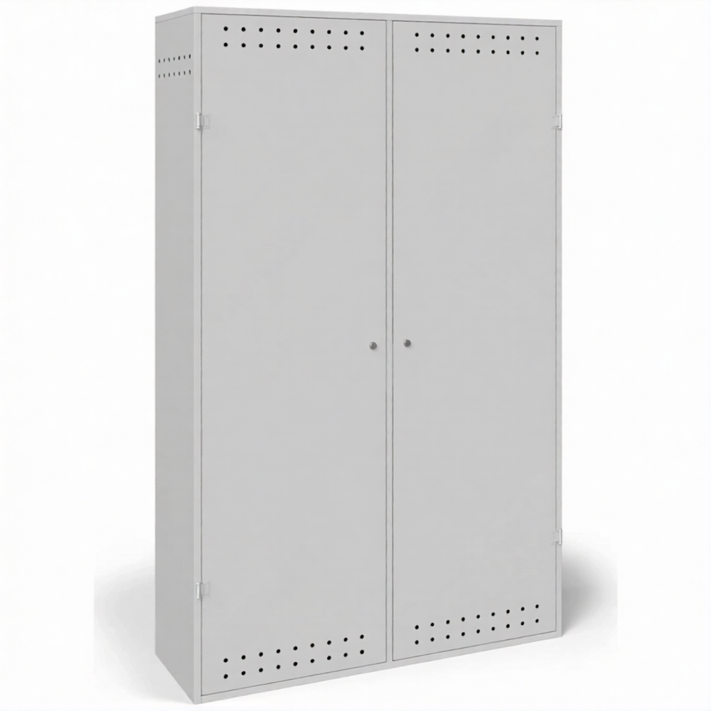 - Обеспечение требований пожарной безопасности — металлический корпус изолирует баллоны от возможных источников возгорания, искр и тепла. Наличие системы естественной вентиляции (перфорация или вентиляционные решетки) предотвращает образование взрывоопасной концентрации газа в случае микроутечки, что строго соответствует нормам ППР в РФ.