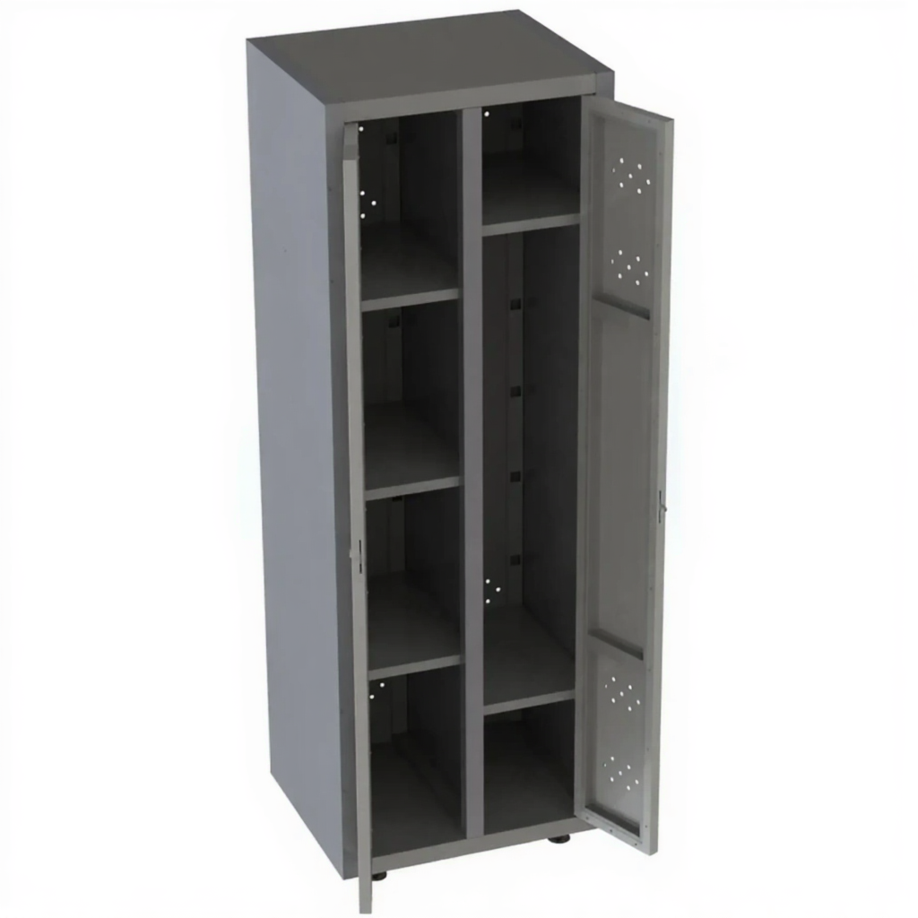 - Двойная функциональность в одном корпусе — шкаф разделен на две логические зоны: одну для хранения рабочей или специальной одежды на крючках или полках, и другую — для размещения уборочного инвентаря (швабр, ведер, моющих средств). Это позволяет решить две задачи, экономя ценное пространство.