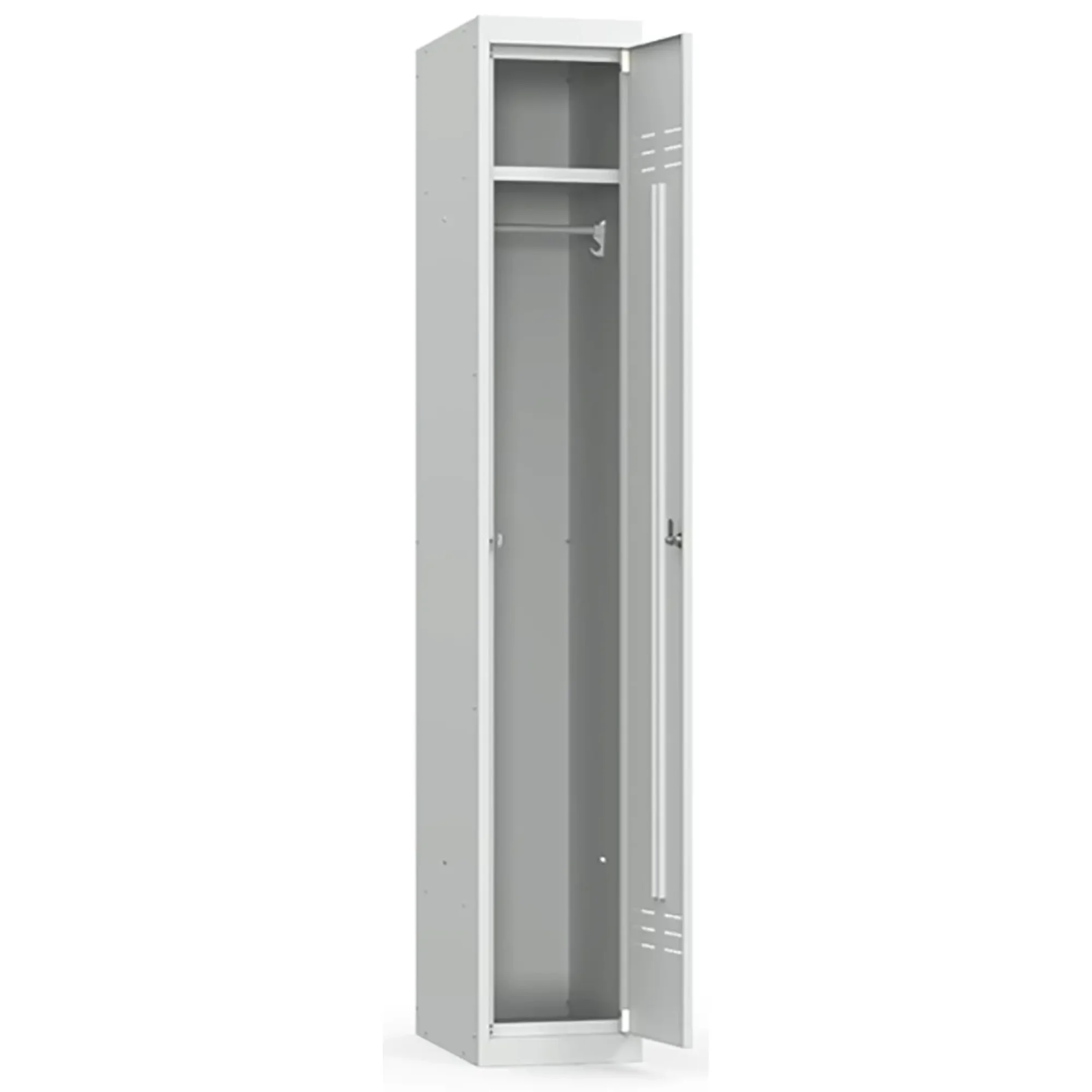 1 секция. 1 ячейка. Полка для головного убора, 2 пластиковых крючка для одежды, пластиковая штанга для вешалки. Отверстие для крепления полок для . Почтовый замок "Euro-Locks". Жалюзи на дверцах. Сборка на заклепках. В комплект поставки входят заклепки. 22 кг, 0,10 куб.м (в упаковке).