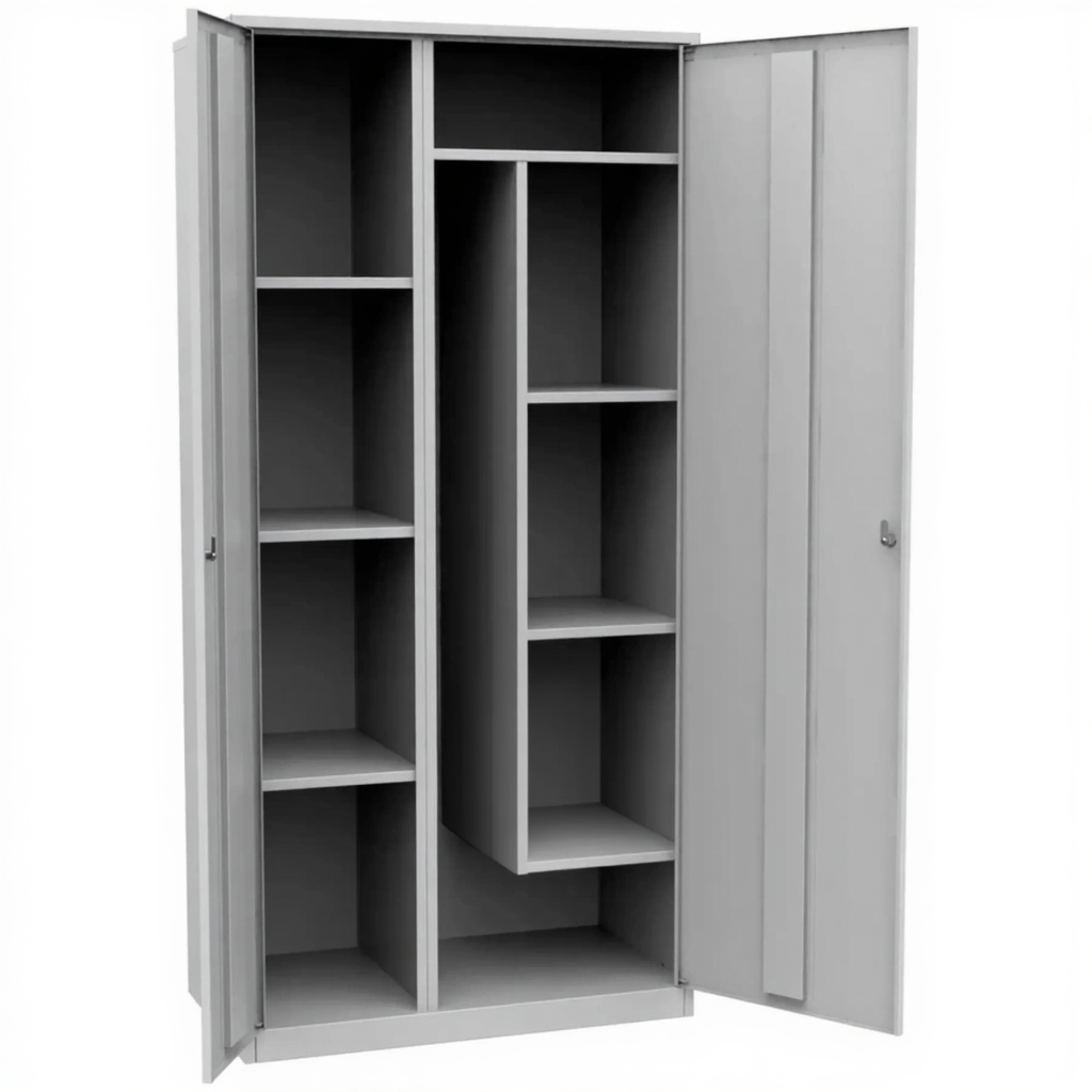 - Универсальность использования в различных зонах учебного заведения — модель подходит для применения в разных помещениях школы: классах, лабораториях, столовых, спортивных залах и медицинских кабинетах, обеспечивая везде безопасное и организованное хранение хозяйственного инвентаря.
