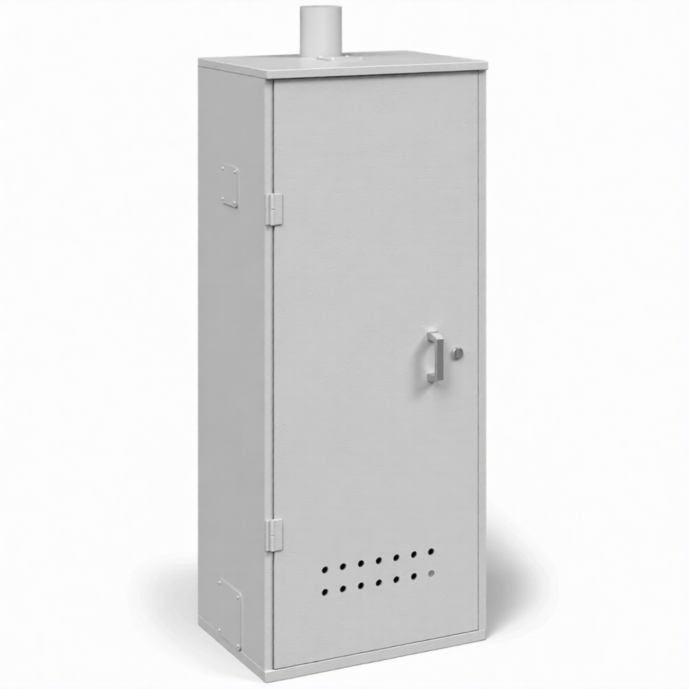 - Обеспечение высочайшего уровня пожарной безопасности — металлический корпус изолирует баллон. Система вентиляции, спроектированная с учетом наличия патрубка, обеспечивает эффективный воздухообмен для отвода возможных утечек. Закрытое исполнение с выводом шланга через патрубок снижает риск механического повреждения коммуникаций и контакта газа с внешней средой.