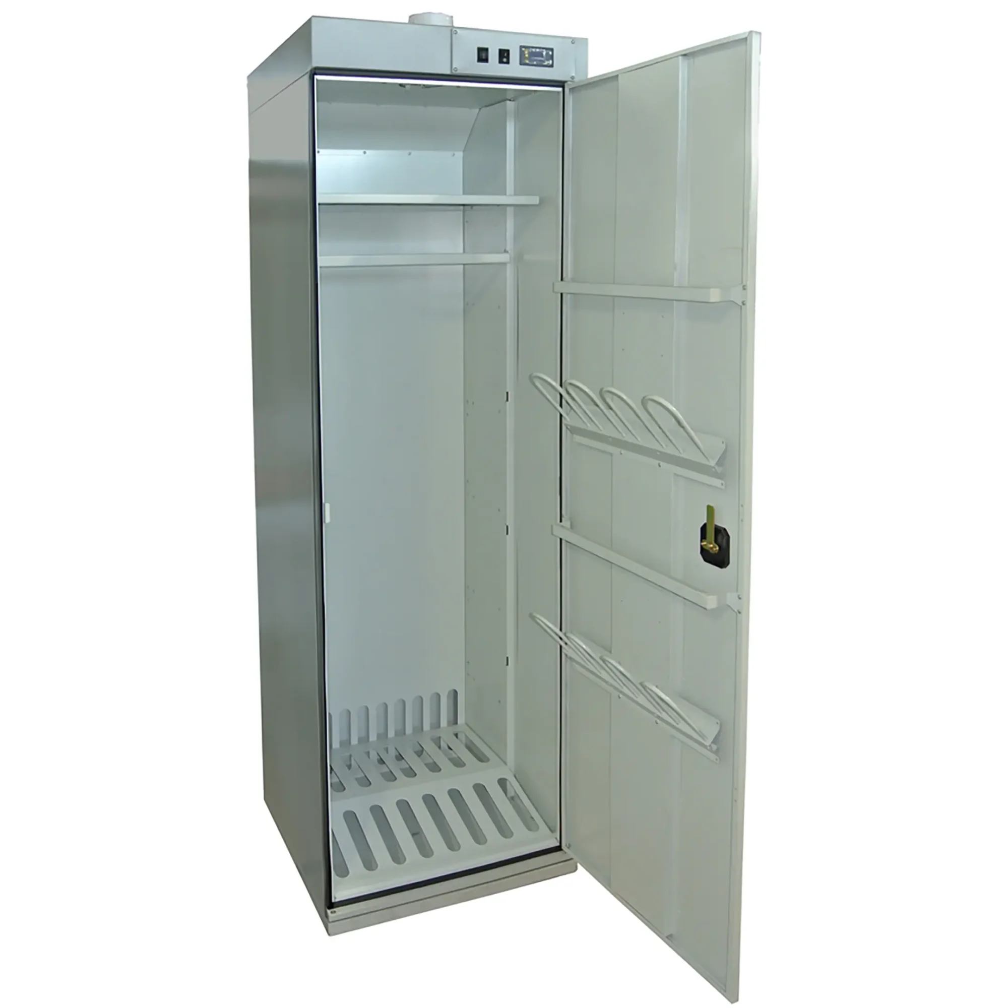 - Универсальность и компактность — шкаф предназначен для одновременной сушки как одежды (спецодежды, спортивной формы), так и обуви. Его компактные габариты делают модель идеальной для помещений с ограниченным пространством, таких как небольшие раздевалки, кабинеты персонала или учебные классы.