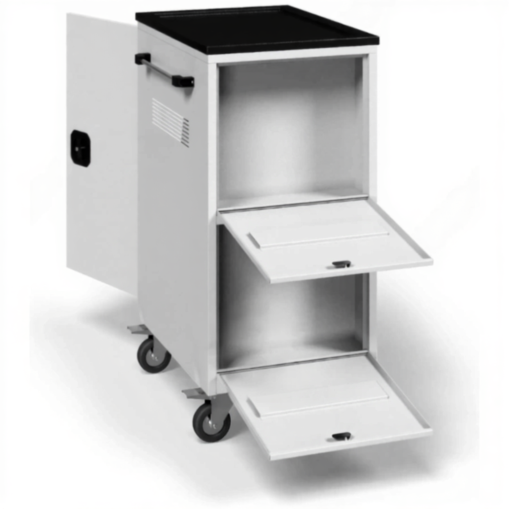 - Повышенная мобильность и безопасность — прочная металлическая рама на колесах обеспечивает легкое перемещение тяжелого груза, а надежные замки защищают дорогостоящее оборудование от кражи и несанкционированного доступа.